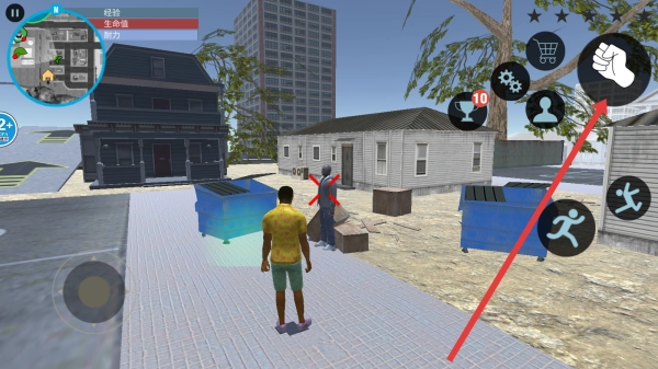 当遇到身上带有红叉标记的敌人时,你可以点击拳头图标对其发起近战攻击;同时,也别忘了留意周围的环境,或者拾取场景中的武器(比如路边的物品)来进行远程打击。