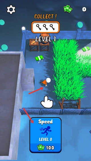 在Level1阶段,你需要操控角色进行移动,过程中要优先去收集绿色钞票。当积攒的金额达到100元时,就可以升级Speed属性,以此来提高行动效率。