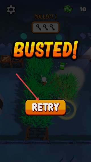 要是被发现显示BUSTED,就点击RETRY重新挑战,调整策略,继续收集钥匙和钞票。