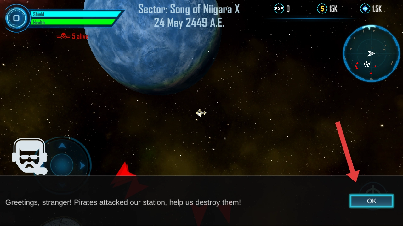 进入游戏后,你得点击右下角的OK按钮,接下摧毁攻击空间站的海盗这个任务,这样才能开启太空战斗。