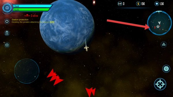 需要依据右上角雷达上的红色目标标记,操控飞船朝着海盗所在方位行进,规划航线时要注意避免走弯路。