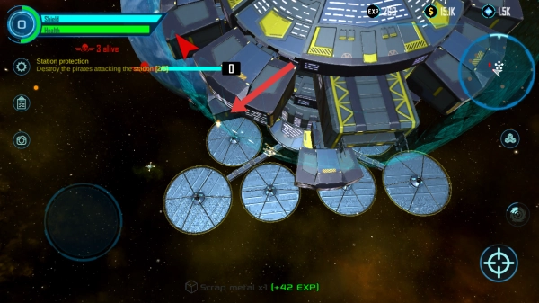 靠近空间站后,攻击剩余海盗的进度从0/5开始推进,与此同时收集战斗掉落物(比如Scrap metal),以此提升EXP和资源。