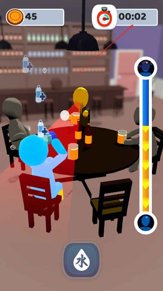 酒局上老板会来回走动查看,右侧的进度条会持续上涨,得在老板没留意自己的空档喝水,以此降低右边的进度条数值。