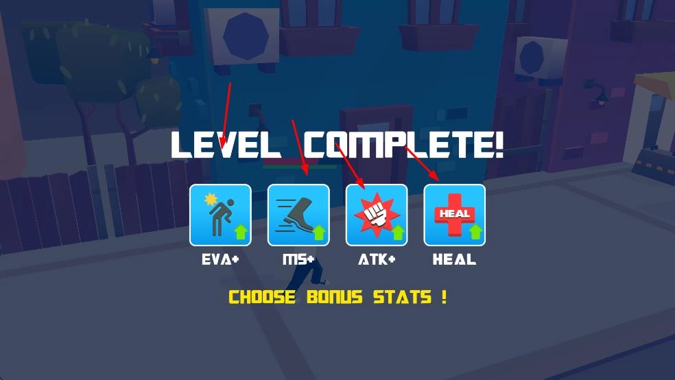 战斗时点击右侧的拳、脚等技能按键来攻击敌人;关卡通关后,可从EVA+、MS+、ATK+、HEAL这些选项里挑选属性加成,以此强化角色。