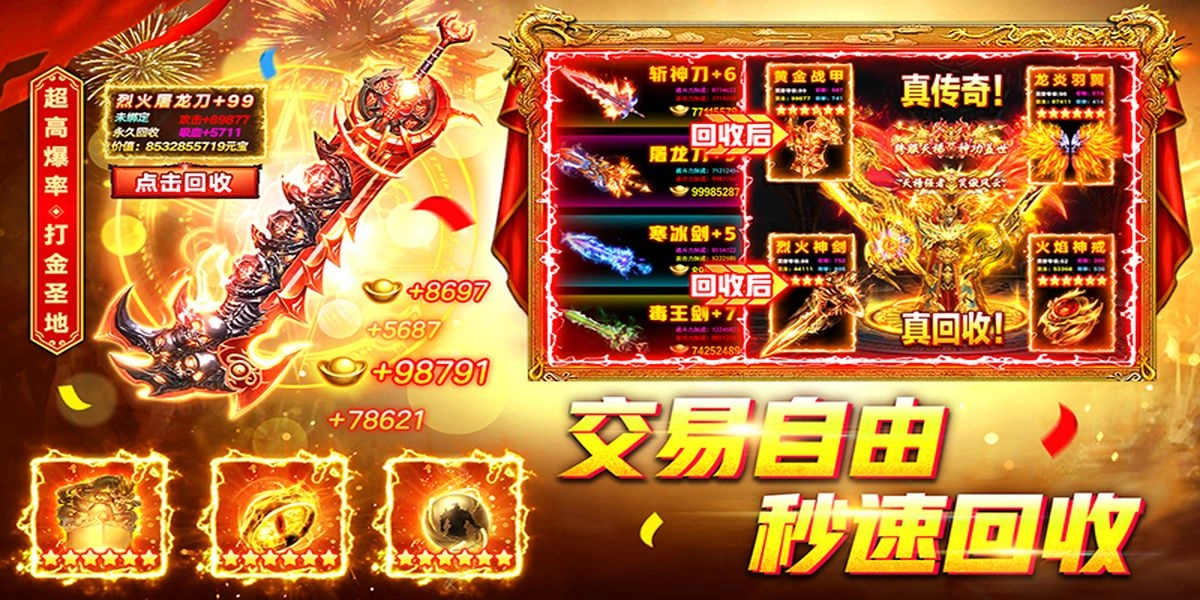 装备保值回收:所有装备都能通过元宝回收系统换成元宝,神装爆率提升到千倍,还能挑战比自己等级高的BOSS,35级的小号也能轻松拿到高阶装备,享受不氪金也不用大量肝时间的打金体验。