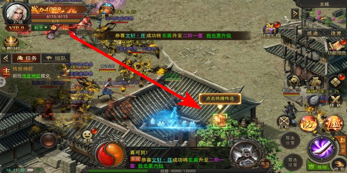 清剿怪物后,通过自动寻路找到侯太乙提交任务,领取经验与资源奖励,用这些奖励强化装备或提升战宠等级,逐步开启转生、图鉴等核心系统,打牢成长根基。