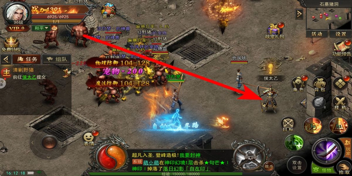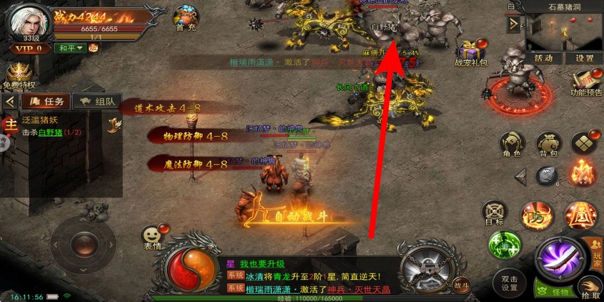 优先接取泛滥猪妖这类任务,开启自动战斗后,战宠和角色协同击杀白野猪等怪物,记得拾取掉落的防御装备,逐步积累物理与魔法防御属性,以此提升生存能力。