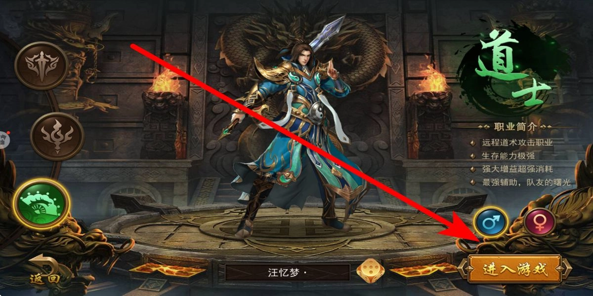 在职业选择界面选定展示的道士职业,确定好角色的名称和性别后,点击进入游戏,即可完成角色创建,同时初步确立职业方向。