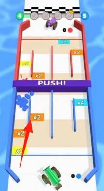 赛道的布局采用水上赛道形式,设有名为“PUSH!”的紫色障碍,需要推动带有x2/x3等倍数标识的蓝色方块,通过组合的方式来扩大体积。