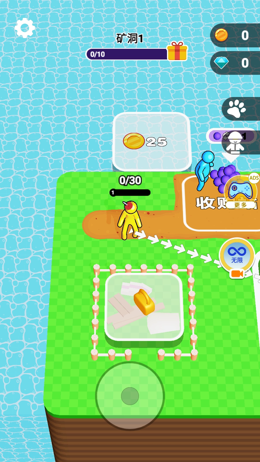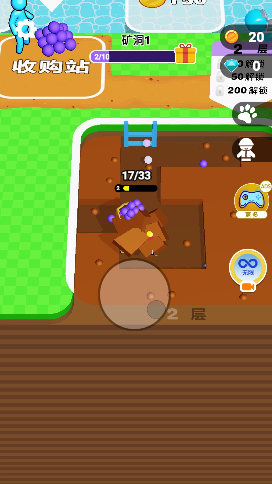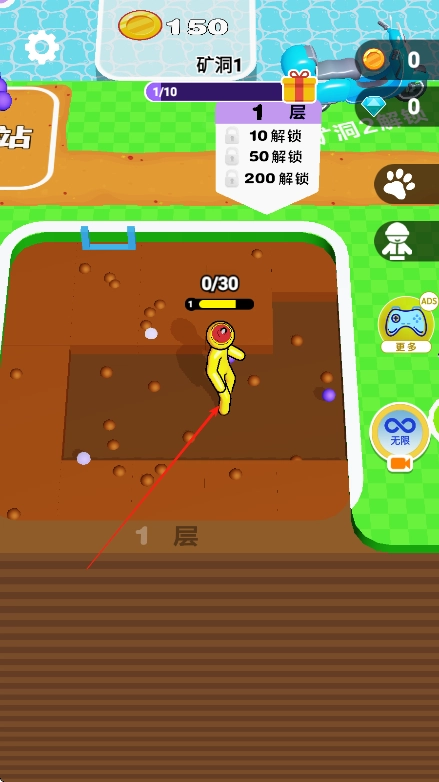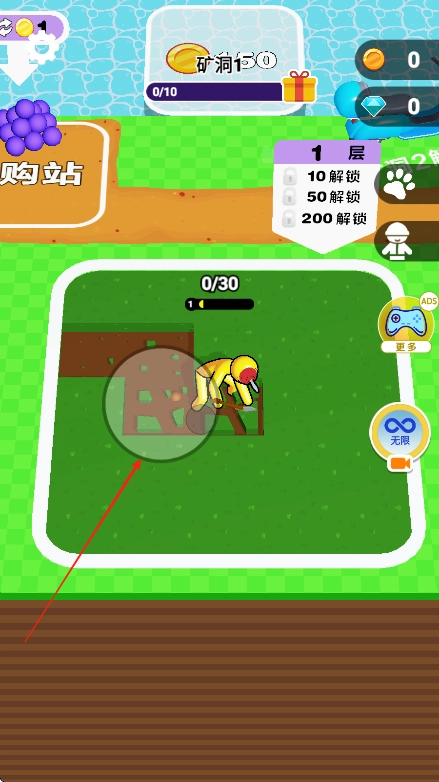 进入游戏后,先查看屏幕上方显示的矿洞进度以及金币、钻石的数量,再借助左下角的虚拟摇杆操控角色移动至挖掘点。