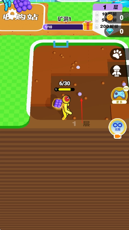 通过积累足量矿石以满足每层的数量要求,就能解锁新的层数并继续挖掘;与此同时,还可以借助金币和钻石在收购站兑换各类道具,以及对装备进行升级。