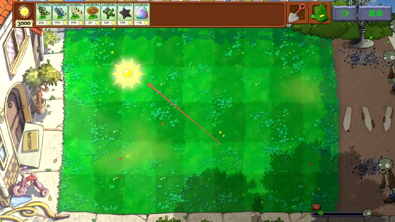 进入游戏后,先点击收集阳光来获取资源,接着选择上方的植物并将其种植到草坪上,以此抵御从右侧出现的僵尸进攻。