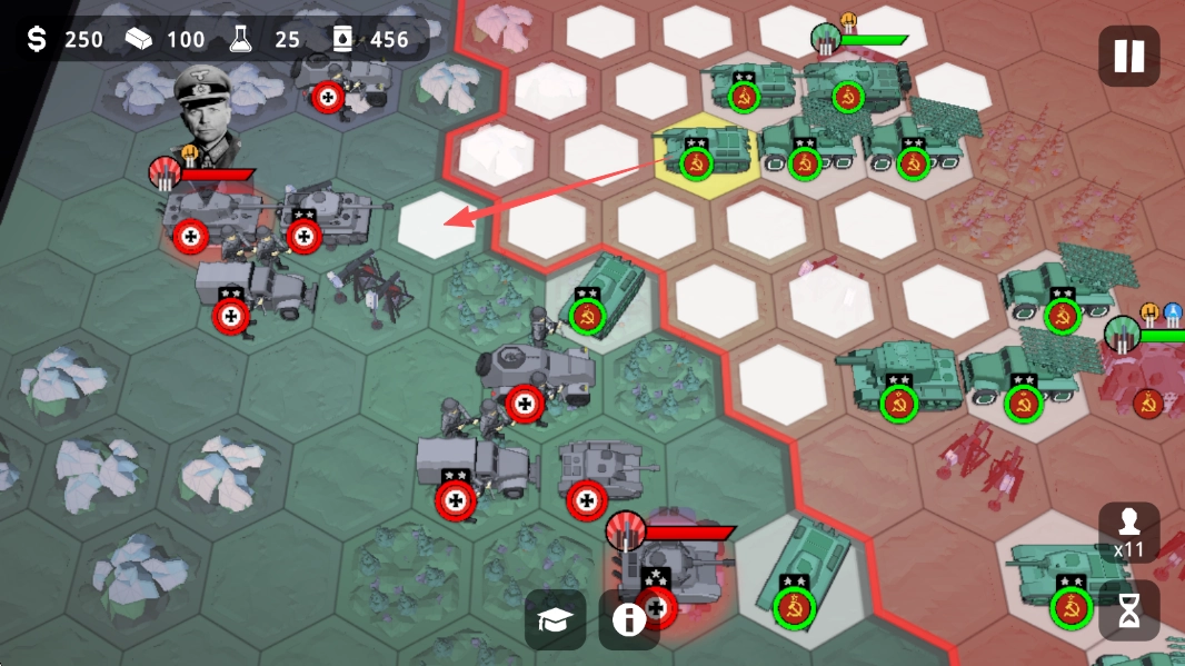 指挥【绿色部队】顺着六边形的格位,向敌方阵地推进,抢占战略上的空白格,压缩对手的空间。