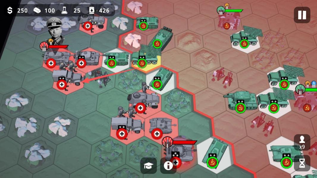 《沙盘战争:钢铁风暴》的核心玩法围绕精准战略决策展开,玩家需合理调配海陆空三军力量,既要抢夺并守护城镇资源,也要推进攻城武器的研发与部署;同时需结合地形特点和地图情报,制定突袭或防御策略,最终达成歼灭敌军的目标。游戏不仅还原了经典二战战役,还设计了丰富的战术变数空间——玩家要在每一轮回合中迅速研判战局,灵活调整兵种搭配与布阵思路,通过攻防之间的博弈击溃对手。