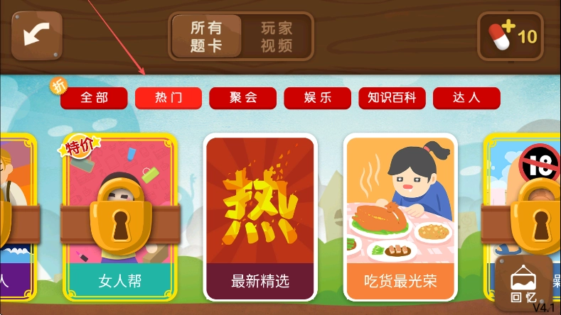 在题卡选择页面的上方,能看到“全部”“热门”“聚会”等不同类型的标签,点击标签即可进行筛选。