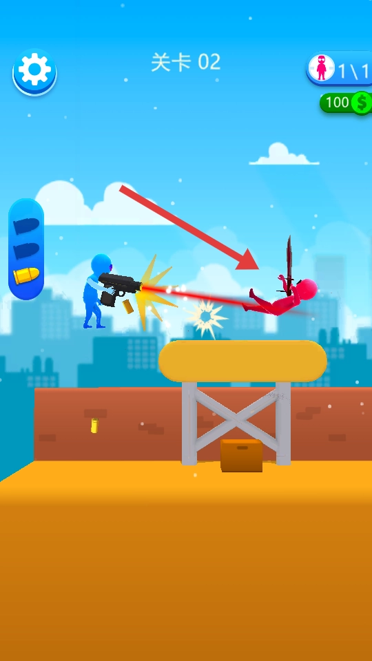 闯关卡02时,蓝方需射击红方并跨越障碍,胜利后获取资源,再用资源升级攻击属性,以此提升伤害效率来通关。