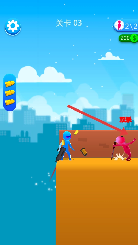 挑战关卡03,操控蓝色角色迎战两名红色敌人,获取胜利奖励后,把奖励用于角色升级,以此增强生存续航与输出伤害的能力,从而更顺畅地推进后续进程。