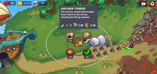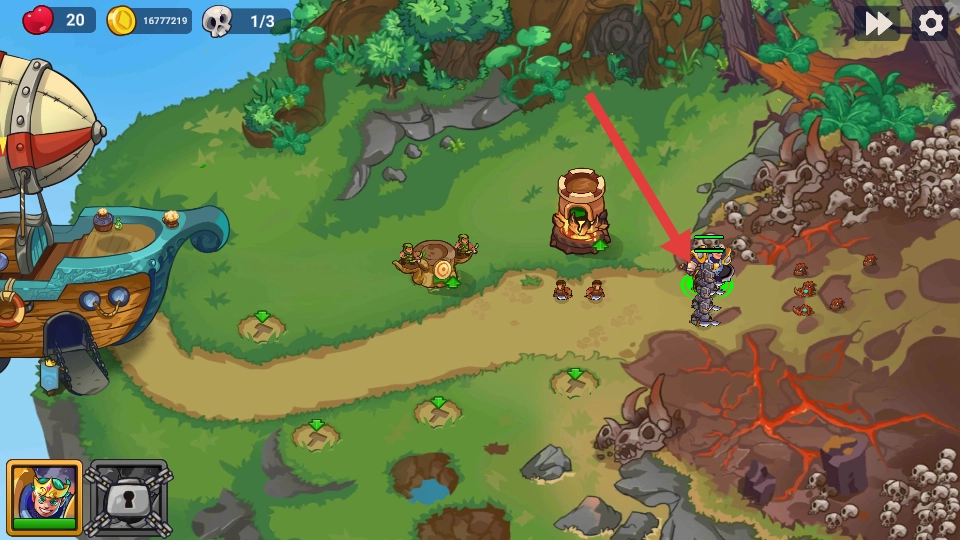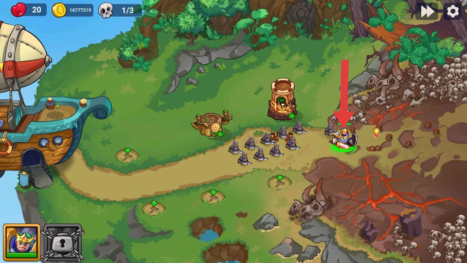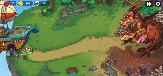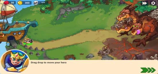 点击英雄并拖动到指定位置来完成部署,与此同时沿着路径建造带有绿色箭头标识的士兵营地,这就是搭建初始防线的操作步骤。