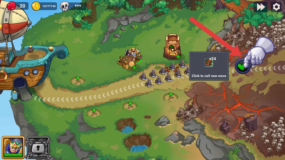 按照界面上的提示找到对应的按钮,根据实际需求点击它来召唤新一波敌人;提前运用英雄的技能以及建筑的火力,瞄准那些高威胁的敌人,以此保证自身的血量安全。