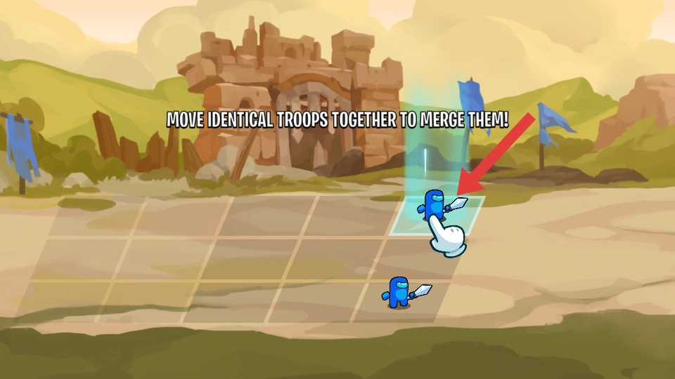 游玩时按照屏幕提示,长按相同兵种并拖动让它们靠近,就能通过调整位置来完成兵种合并。