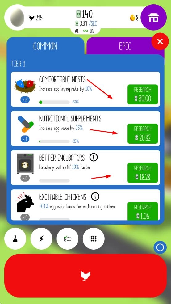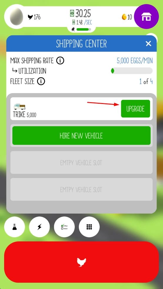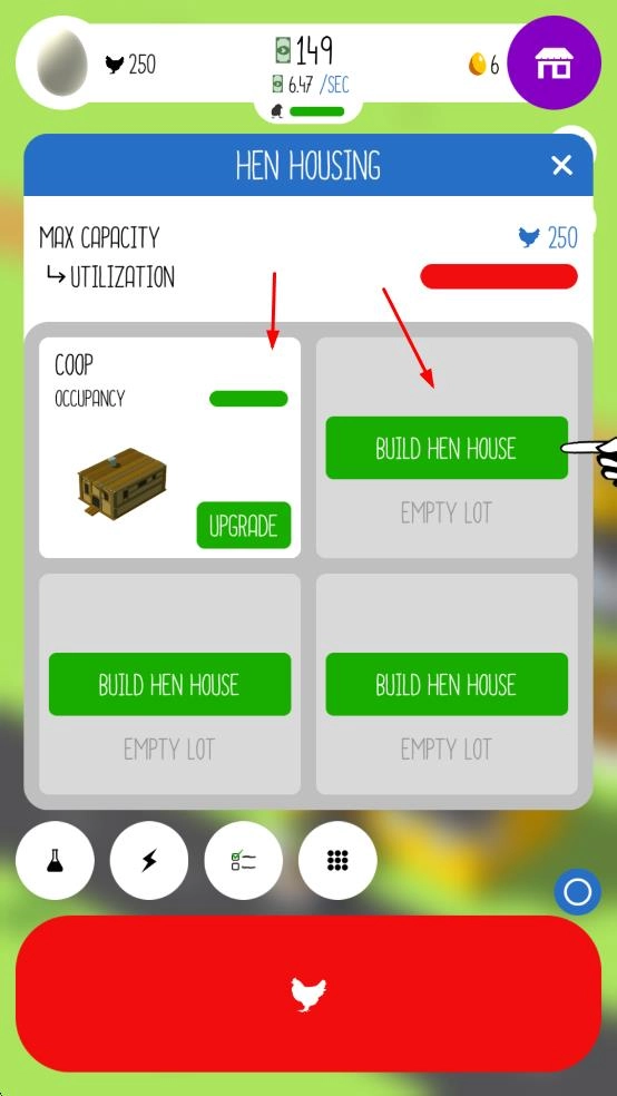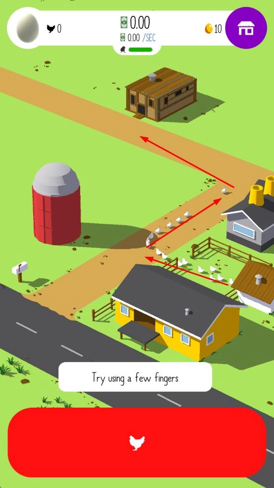 点击红色按钮就能得到鸡,这些鸡会自动下蛋,帮你积攒金币和鸡蛋这两种资源。