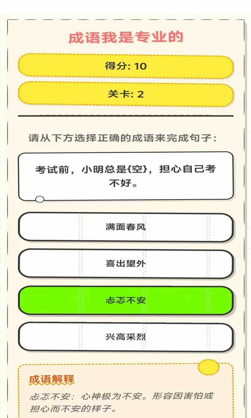 2、开启您的正式闯关之旅吧,每一关都会出现一个带有空格的新句子,您要依据语境和成语的含义来做出精准选择。