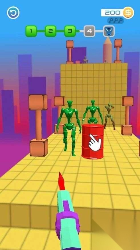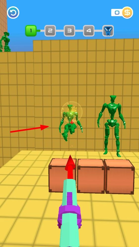 进入界面后,通过滑动屏幕来调整投掷长矛的角度,点击屏幕即可释放长矛。要借助抛物线的轨迹去刺穿站立的敌人,同时得留意躲避蓝色盾牌的防御。