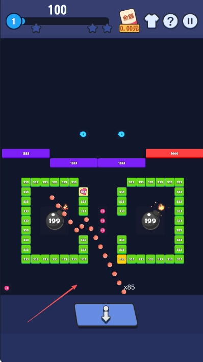 进入游戏后,留意左上角显示的关卡1及对应的进度条;接着点击下方的蓝色按钮来发射弹球,通过弹球撞击带有数字标识的方块以获得分数。