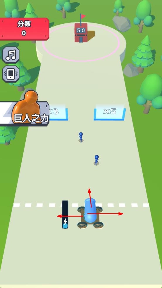 操控蓝色炮车进行左右移动,引导蓝色小人进入倍增区域,以此增加小人的数量,为后续的进攻行动做好准备。