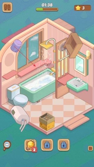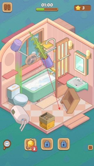 按照浴室的布局特点和实际使用需求,把准备好的置物架、水桶等道具摆放至恰当位置,每成功放置一件合理的物品就能获得一颗星星。