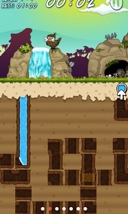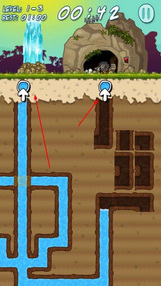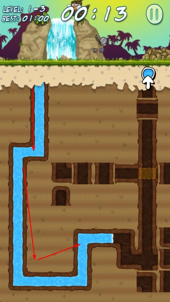 进入1-3这类关卡后,需要规划水渠的走向,引导瀑布水流往目标出口,通过挖掘土壤来开辟通水的通道,为之后的连通工作打下基础。