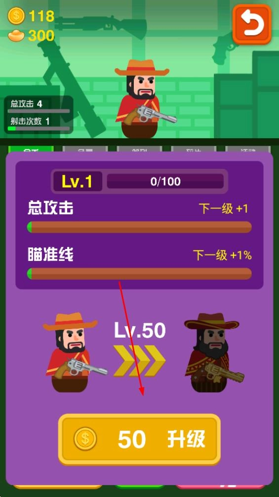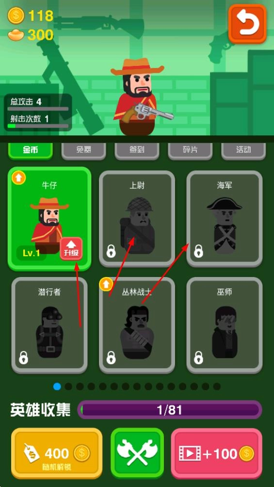 在英雄收集界面,你能够解锁牛仔、上尉等各式各样的角色;挑选角色后,消耗金币进行升级,以此提升总攻击、瞄准线等属性,进而增强战斗能力。