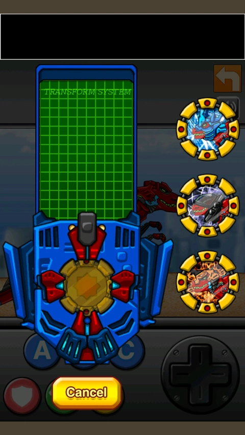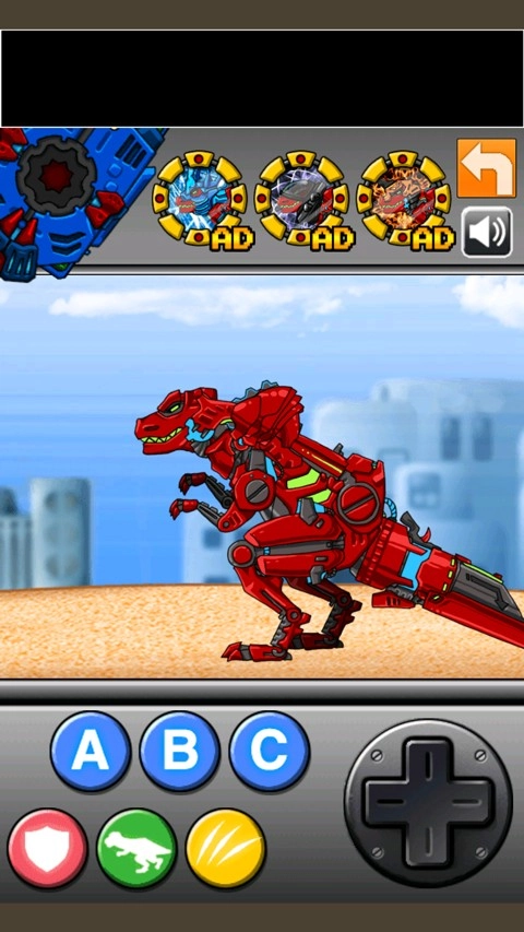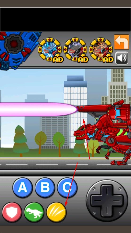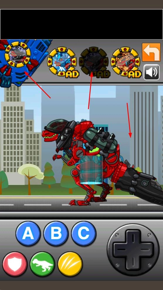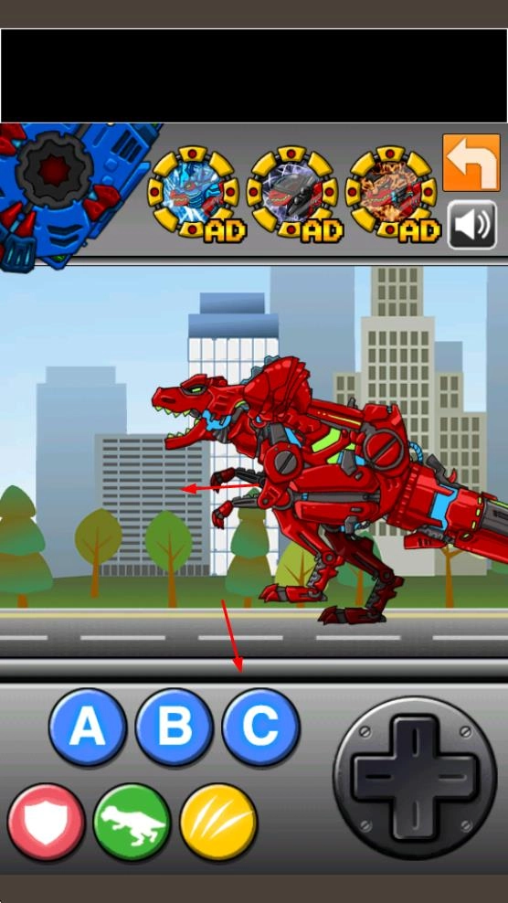 操控红色机甲恐龙在城市场景中移动,借助下方的ABC等按钮完成基础操作,为战斗做好前期准备,开启城市战斗的冒险之旅。