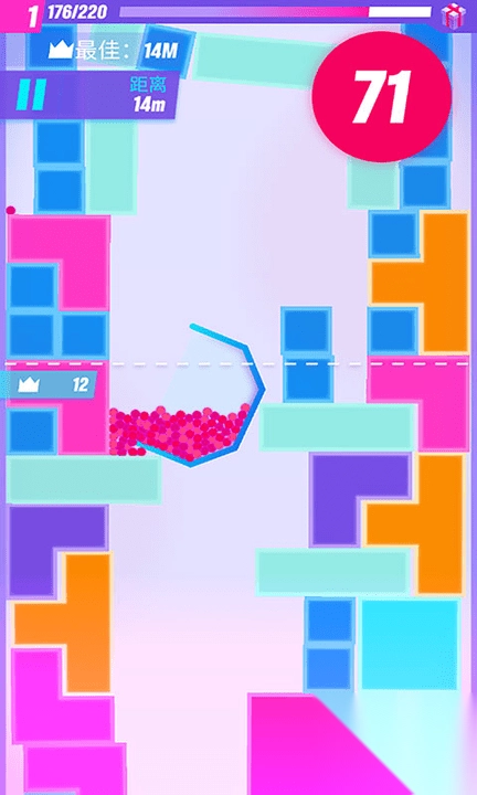 当容器触底时,若小球留存数量超过80%就能通关,累计通关可解锁彩虹色小球、防滑容器等外观,还能挑战设有随机陷阱的进阶关卡。