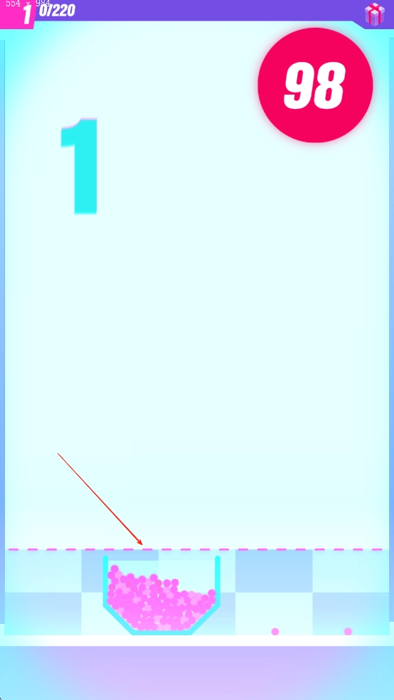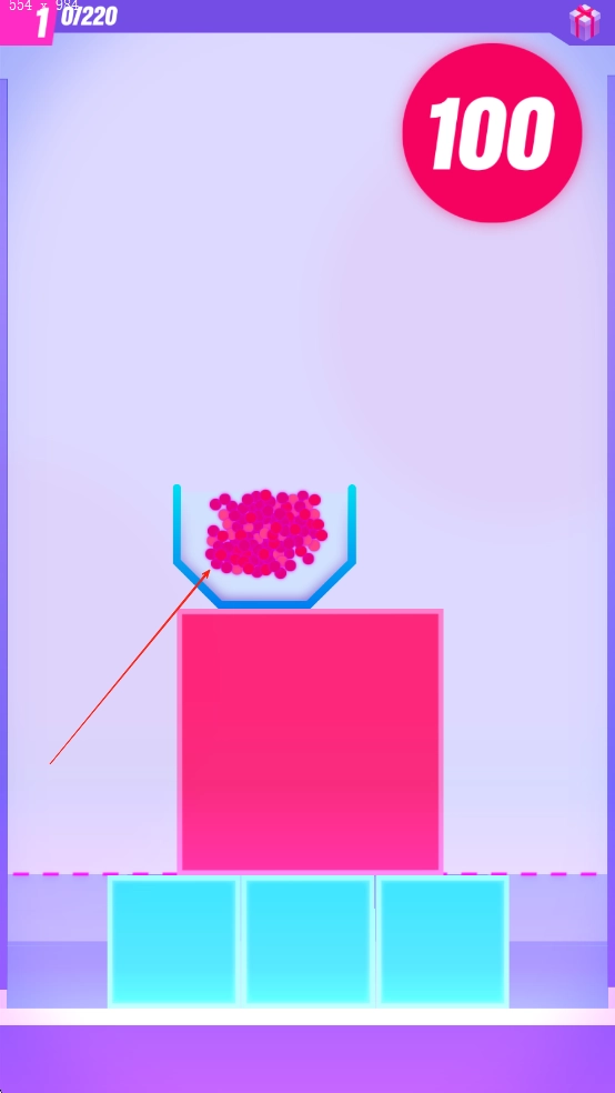 进入游戏后,点击屏幕上的任意方块,就能操控带孔容器从顶端下落。第一次挑战时,得适应重力作用下容器倾斜角度的控制方式,防止小球直接弹出去。