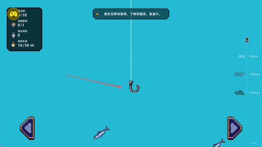 进入游戏界面后,借助左右两侧的按钮操控鱼钩移动,按照提示可知,鱼钩下降的深度越大,钓到体型更大的鱼的概率就越高。