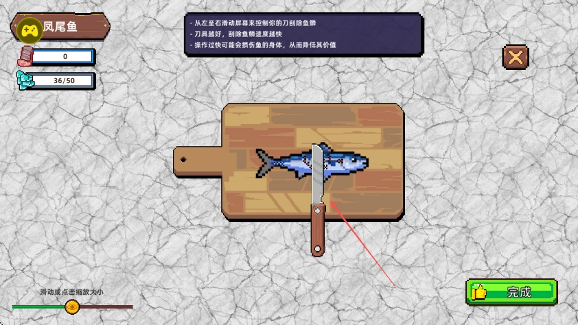 鱼获已进入处理阶段,请按照提示从左向右滑动屏幕,操控刀具刮去鱼鳞,操作时请注意速度。