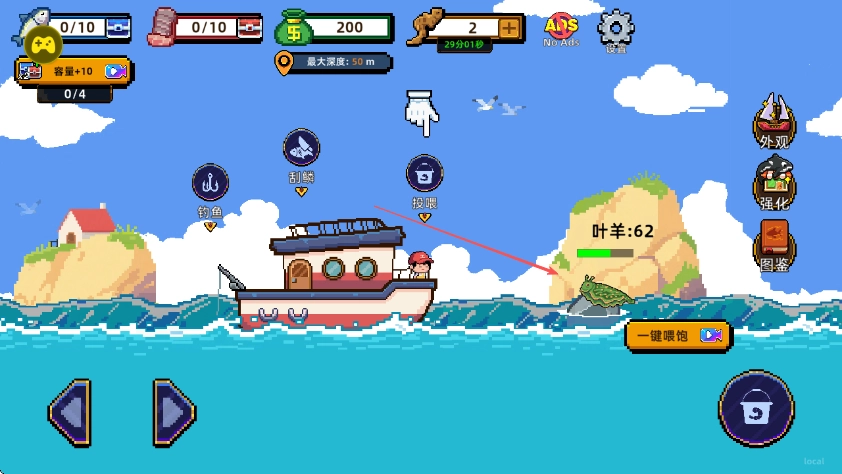 回到主界面后,你可以选择钓鱼、刮鳞、投喂等功能,还能借助强化、图鉴等系统来提升游戏体验。