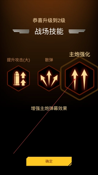 战机完成升级后,会弹出战场技能的选择界面。例如,在主炮强化选项中,若选择“增强主炮弹幕效果”并点击确定,即可实现战力的提升。