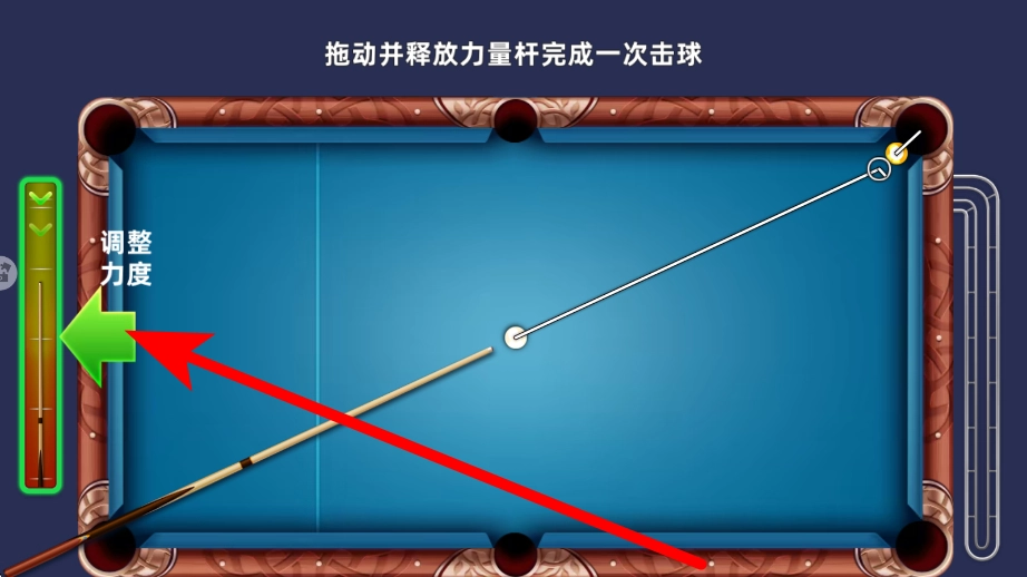 调整击球力度时,需拖动力量杆,依据击球需求调整至合适力度,随后释放力量杆以完成击球,从而控制台球的运动轨迹与力度。