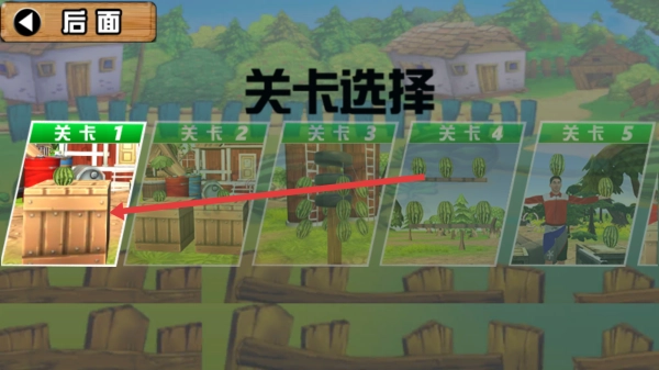 点击“开始”按钮后,页面会跳转到关卡选择界面,选择“关卡1”即可进入游戏。此关卡的场景中包含木箱等道具,点击对应区域就能开启第一关的挑战。
