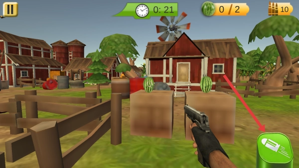 在第1关的战斗环节,你需要操控枪械对准农场里的目标(西瓜)进行射击。过程中要留意剩余时间(当前显示为0:21)以及已收集的数量(目前是0/2),要是弹药不足,就点击右侧的绿色技能按钮来补充,完成这些要求即可通过挑战。