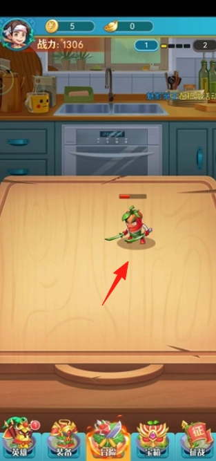 合成辣椒角色(红箭头所指),点击下方的“冒险”功能入口,通过操控角色进行战斗,成功击败关卡内的敌人后,即可获取相应奖励,进而提升战力(从当前1306提升至更高数值)。
