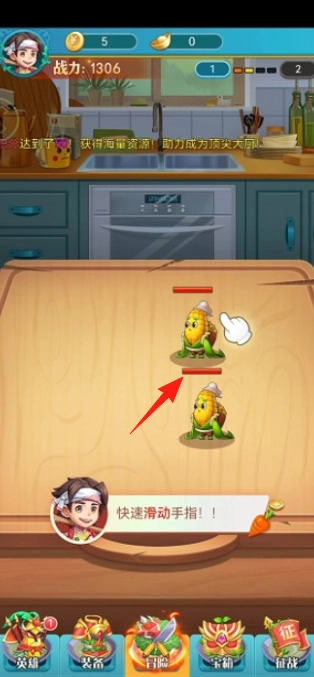 在案板(红箭头所指位置)上快速滑动手指,合成玉米食材,以此触发互动机制,提升食材等级,同时积累资源(可获得5枚金币),为接下来的冒险做好准备。