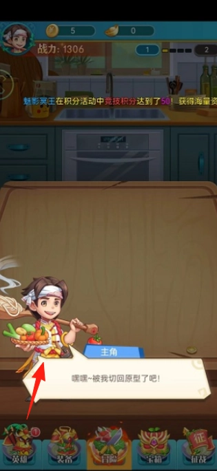点击标有红箭头的主角,查看其1306的战力数值,随后进入厨房场景,领取“切回原型”的提示,最后解锁位于下方的英雄装备功能。