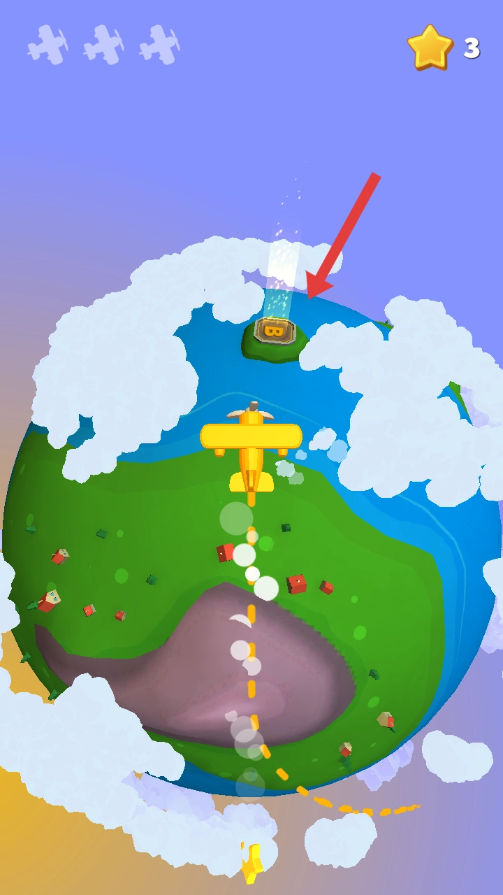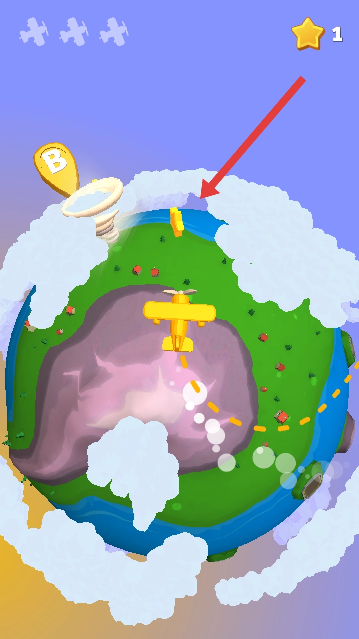 驾驶飞机时请务必留意,不要靠近箭头所指的白色龙卷风区域;一旦距离过近,飞机就会被卷入其中,届时需要重新开始游戏。