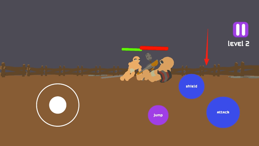 进入第二关的战斗场景后,左侧摇杆负责角色移动,右侧设有防御(shield)、跳跃(jump)和攻击(attack)三个按钮。遭遇敌人时点击攻击键发起进攻,同时要灵活运用跳跃躲避敌方攻击,借助防御技能抵挡伤害,通过与对手比拼操作技巧来赢得这场战斗。