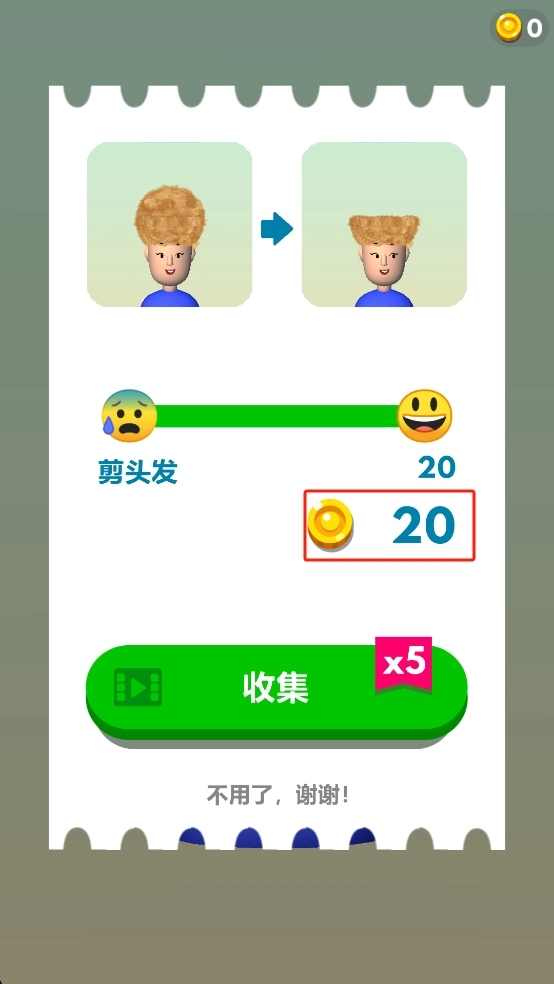 剪发完成后,界面会显示可领取20金币,点击下方的绿色收集按钮,就能获得奖励并通过本关卡。
