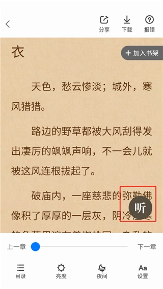 3、进入阅读界面,点击屏幕中心,它会弹出各种功能,点击听;