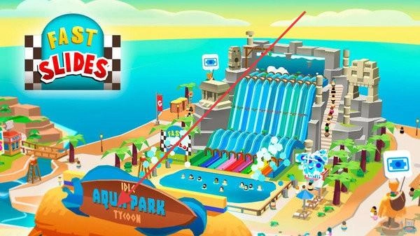 先从“园区初建”开始!选定“FAST SLIDES”水上园区,3秒就能放置好游乐设施,注意不要留下空白地块,每摆放一个滑梯,就能获得100金币。